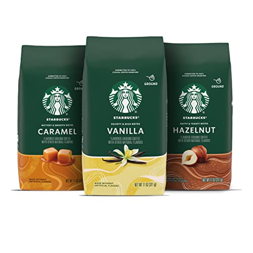 You asked. We answered. The Starbucks Flavored Ground Coffee 3 Bag Variety Pack is here. Our variety pack lets you explore three of our most popular flavored coffees that deliver the delicious flavors you love. Starbucks Caramel Flavored Coffee has buttery and smooth caramel flavor to satisfy sweet cravings, Starbucks Vanilla Flavored Coffee is full of the velvety and rich flavor that’s anything but plain and Starbucks Hazelnut Flavored Coffee is nutty and toasty with rich hazelnut flavor. Go ahead, entice your palate with a cup from all three varieties. Nestlé uses Starbucks trademarks under license