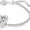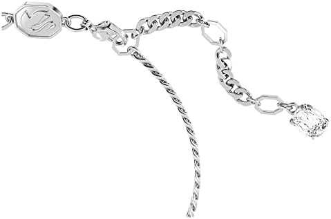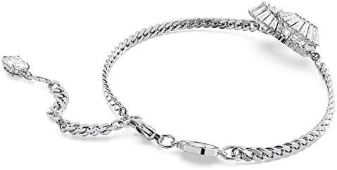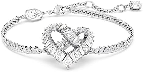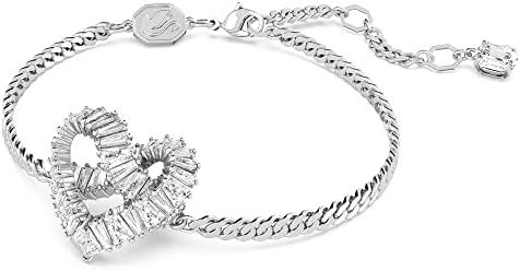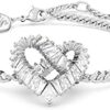 Items delivered: (1) Swarovski Matrix bracelet with a woven heart design and clear crystals on a rhodium finished chain with a single round stone at the end, complete with Swarovski bracelet box