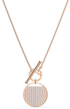 Items delivered: 1 x Swarovski Ginger Collection necklace, 17 3/4 inch rose-gold tone plated chain, 1 1/8 x 3/4 inch clear crystal pavé circular design pendant, with Swarovski necklace box