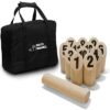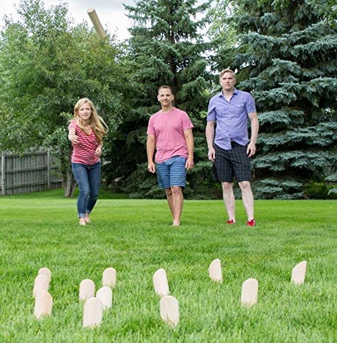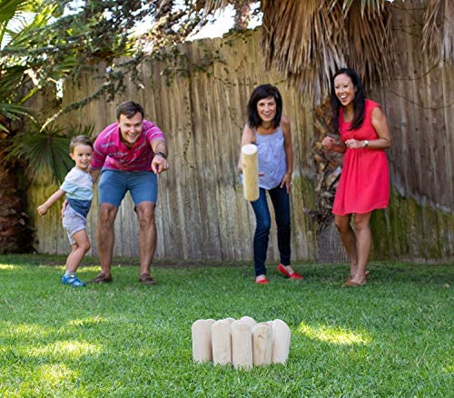 Scatter blocks (also known as Skittles, Mölkky, and Finska) updates a centuries-old tossing game into a yard game that’s fun for the whole family. Group the blocks together and break them apart with one mighty underhand throw! The blocks get reset where they land, drifting farther apart with every throw. Knocking multiple blocks on a throw earns a point for each block toppled, but knocking a single block earns the number of points on the block, meaning skill and strategy become more important as the game progresses!