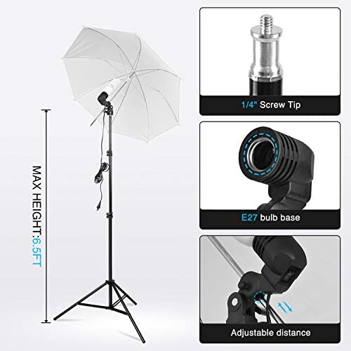 【2x Photography Umbrella】33 inch diameter lighting umbrellas diffuse light, weaken shadows, make model portrait and product shooting softer and more delicate, get ideal lighting effect by matching with common softbox or flash. The height of light stand can be adjusted between 26inch-79inch. manually adjust distance between light bulbs & umbrella to get best light.