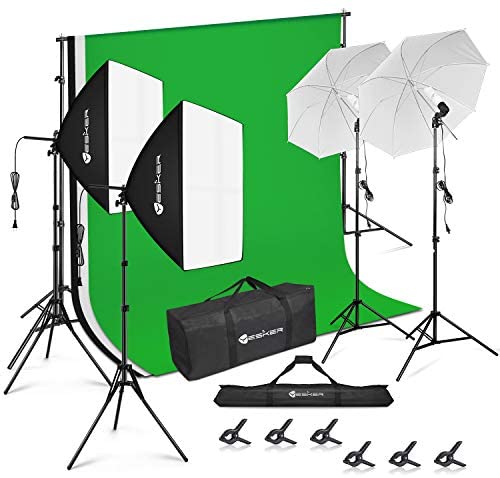【Full set】 Good first starter kit for professional/home studio. Include everything basic you need to start: (4)79-inch/200cm Light Stand; (2)Single Head Light Holder; (2)45W CFL Daylight Bulb;(2)85W Energy Efficient Bulb; (2)33-inch/84cm Umbrella; (2)24×24-inch/60x60cm Softbox; (1)6×9 ft/1.8×2.8M Muslin Backdrop(Black, White and Green);(6)Backdrop Clamps; (1)8.5x10ft/2.6x3M Background Stand Support System;(1)Carry Bag for Background Support System; (1)Carry bag for Continuous Lighting Kit